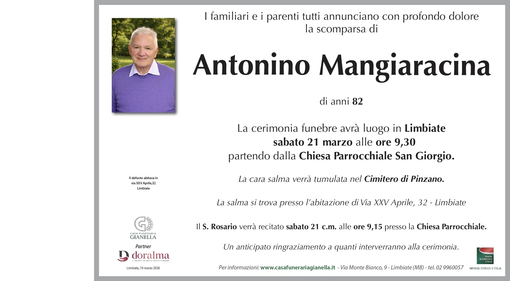 Antonino Mangiaracina di anni 82