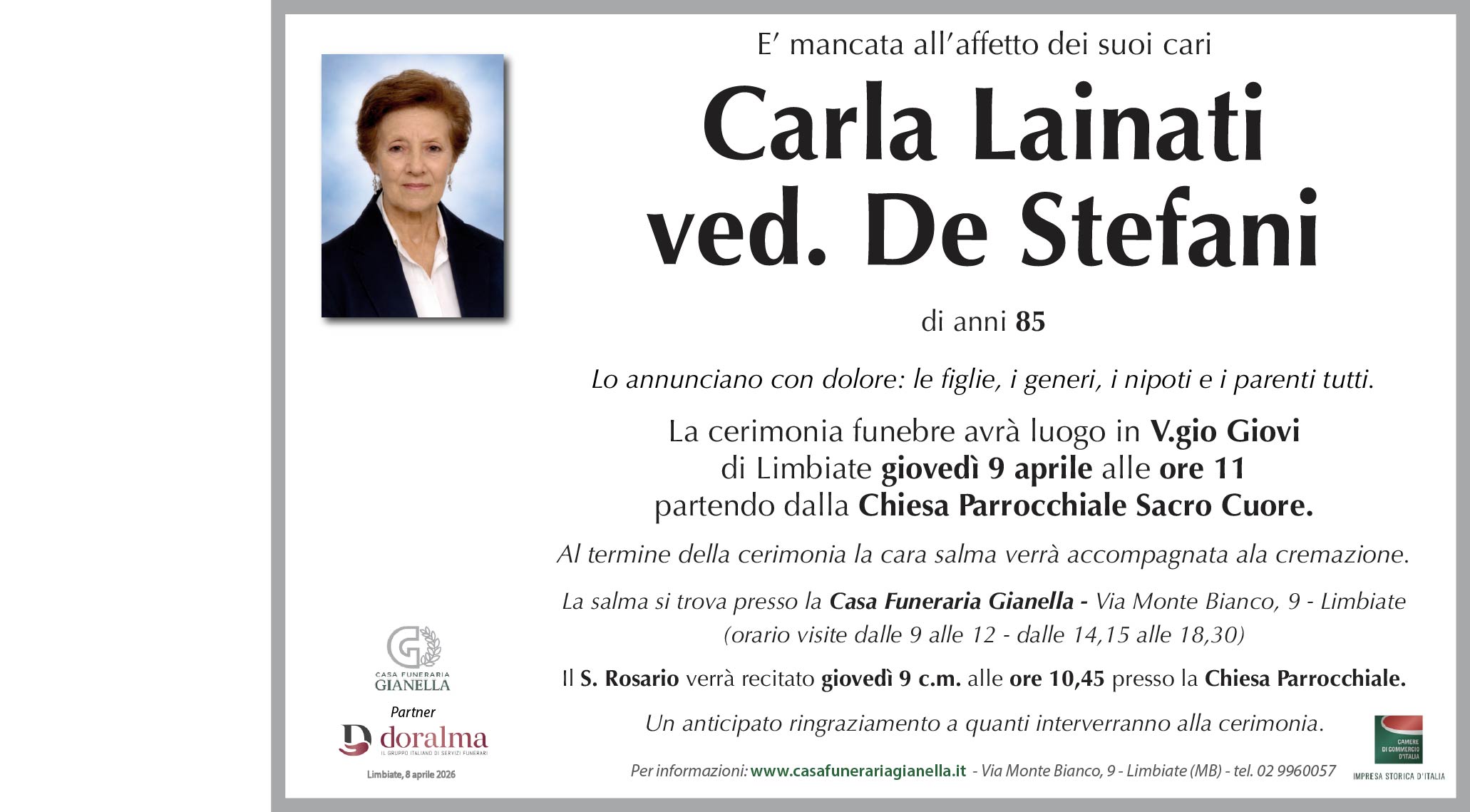 La cara salma si trova presso la Casa Funeraria Gianella - Via Monte Bianco, 9 - Limbiate (MB) - orario visite dalle 9 alle 12 e dalle 14,15 alle 18,30