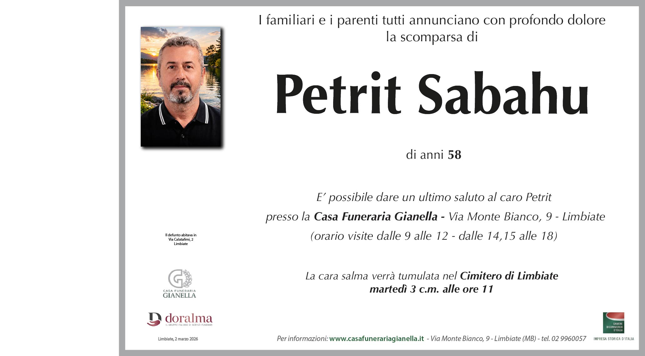 La cara salma si trova presso la Casa Funeraria Gianella - Via Monte Bianco, 9 - Limbiate (MB) - orario visite dalle 9 alle 12 e dalle 14,15 alle 18